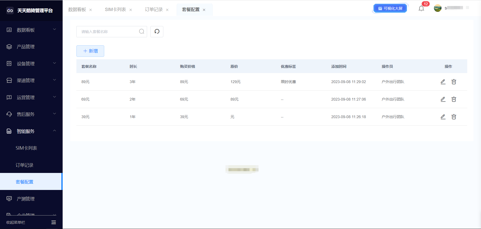 天天酷骑管理平台该功能用于厂商企业自定义配置toC的智能服务套餐,配置后套餐将在App的智能服务中展示,App用户可为自己的智能车辆购买智能服务套餐。