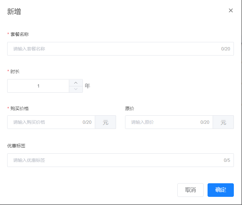 新增套餐:套餐必须配置名称、时长及购买价格,原价及优惠标签作为可选填内容。
