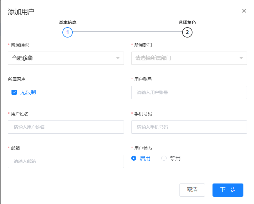 点击左侧机构,可在机构下新增用户账号。给用户匹配组织、网点信息,填写用户账号和手机等信息,然后设置用户角色。