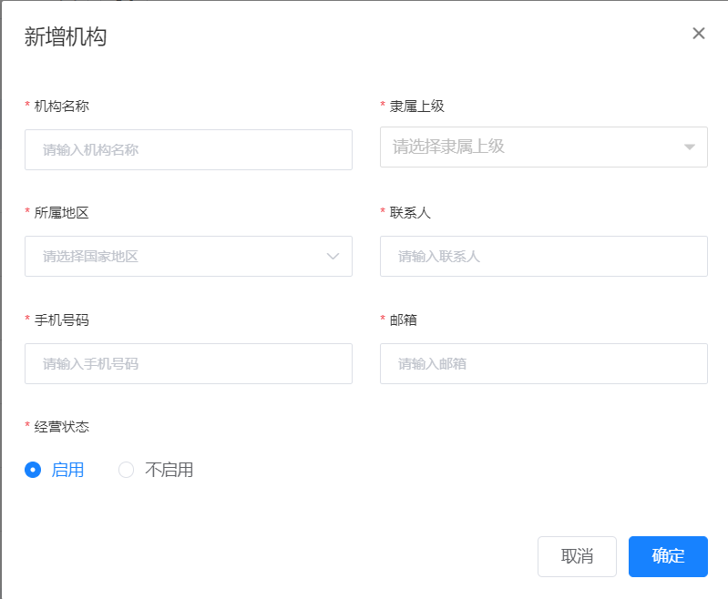 机构管理用于厂商进行企业的组织机构设置,当有代理商/经销商引入时,在次数增加经销商的机构信息。包括其机构名称、隶属上级机构、所属地区、联系人、联系人手机号、联系人邮箱、经营状态。 创建的机构可以在系统用户页面的左侧机构目录树中显示,则可以为该机构新增员工账户,以便其在系统中进行业务管理。